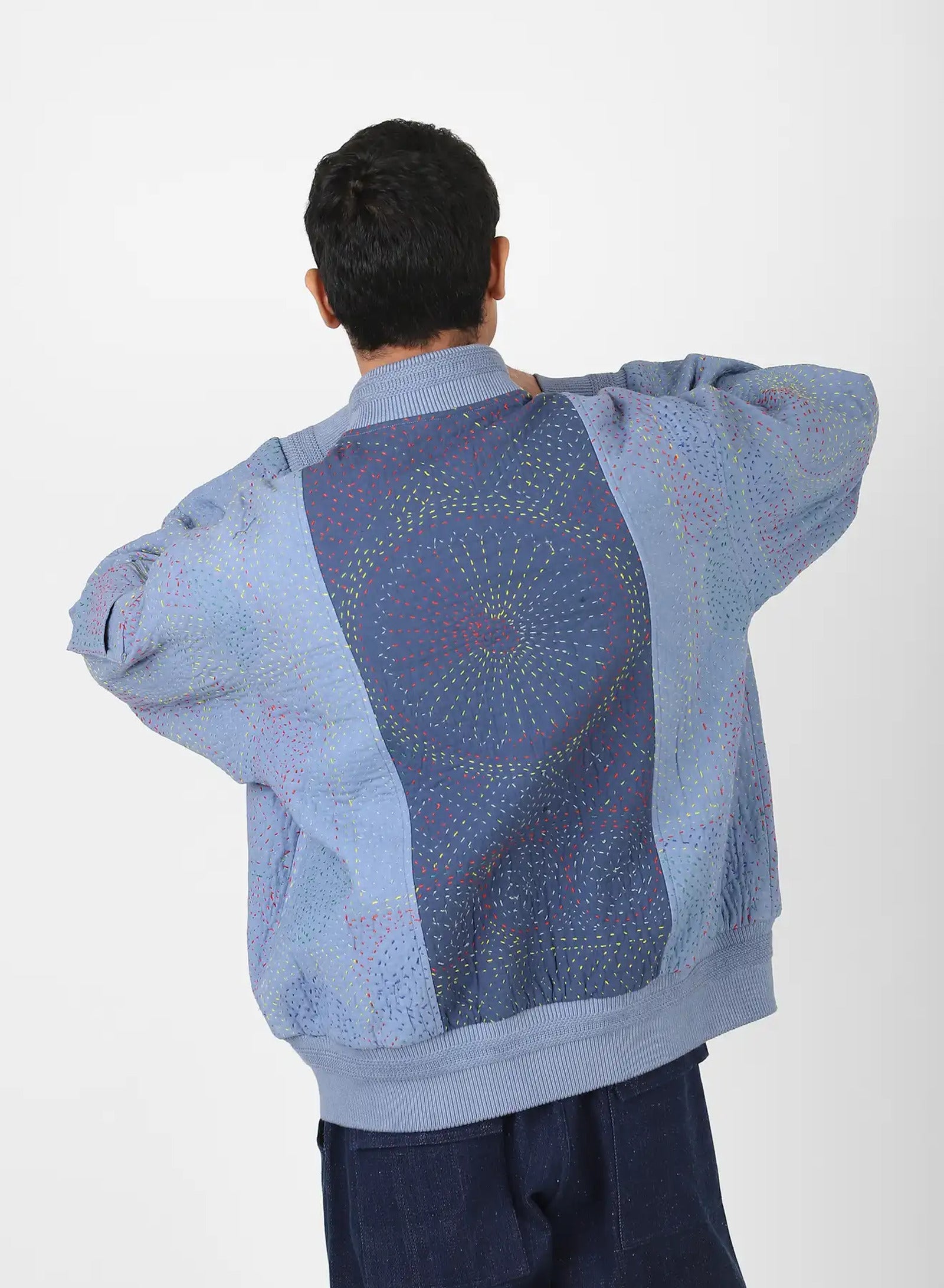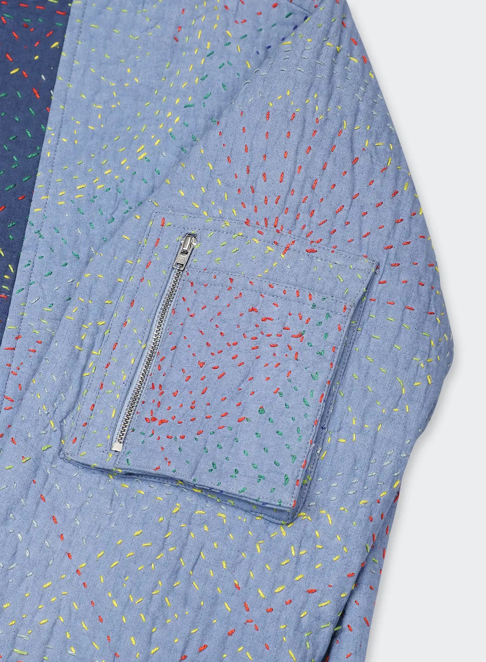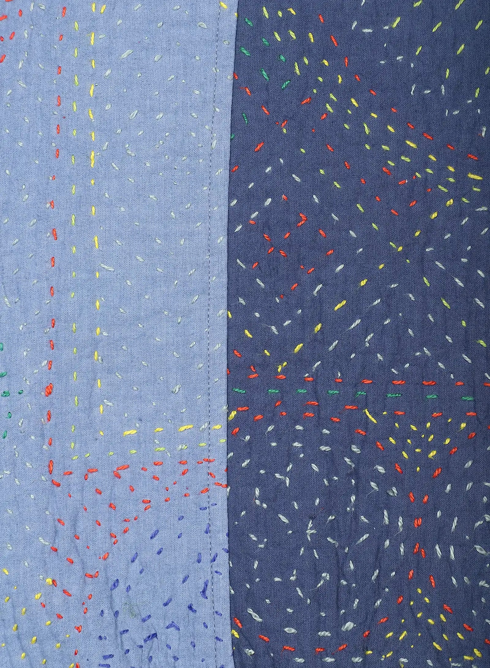 We work with cotton panels that have been overdyed before being joined into garments, each one embroidered in the kantha tradition. The stitching is done by hand in a simple running line, often carried from memory rather than a marked pattern. It binds the layers with strength while leaving a raised surface that changes how the cloth catches the light, bringing dimension to the fabric as it is worn.