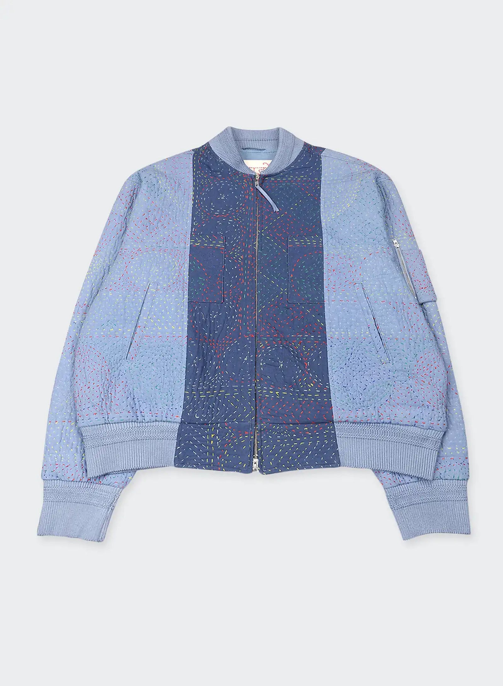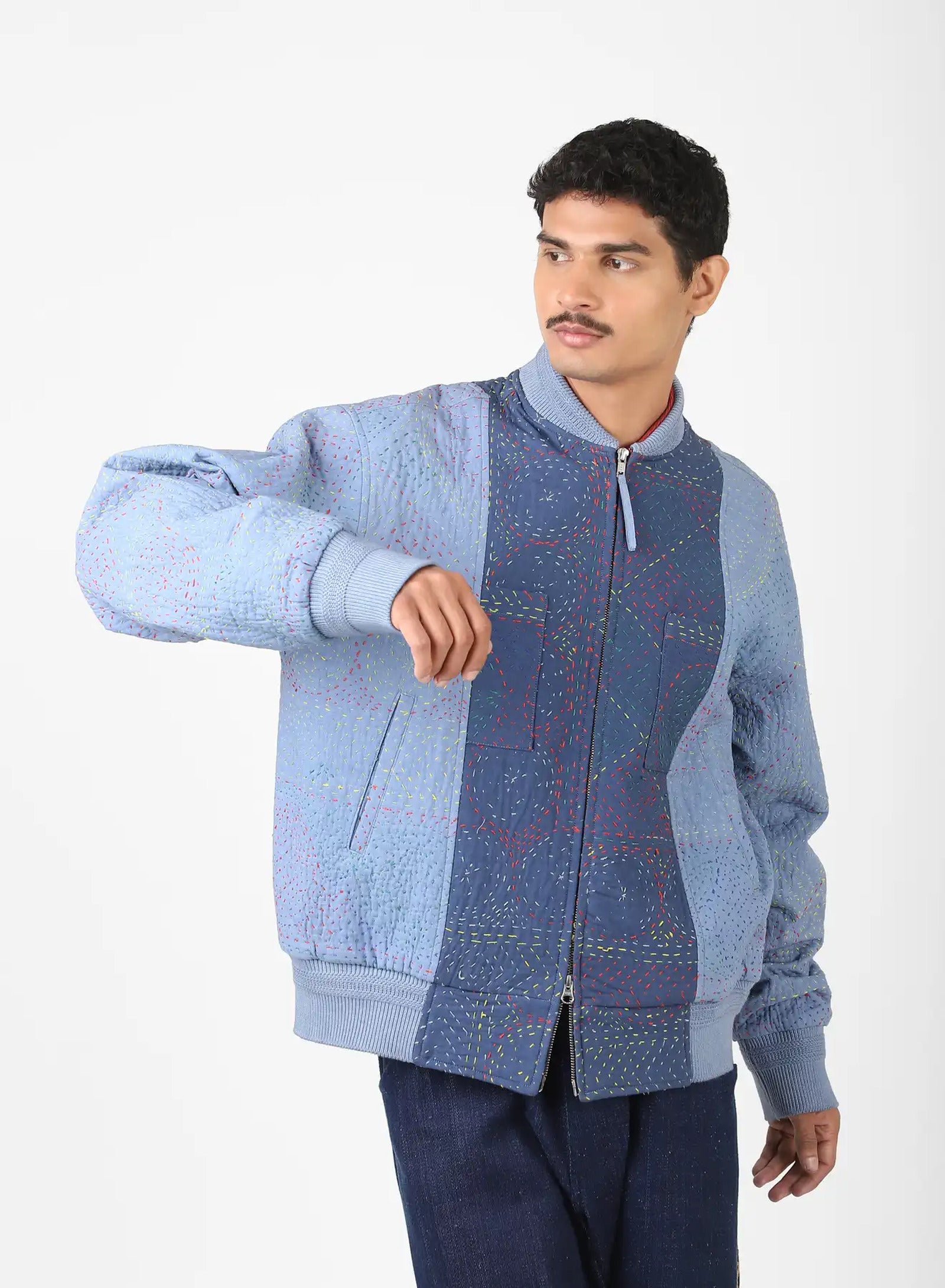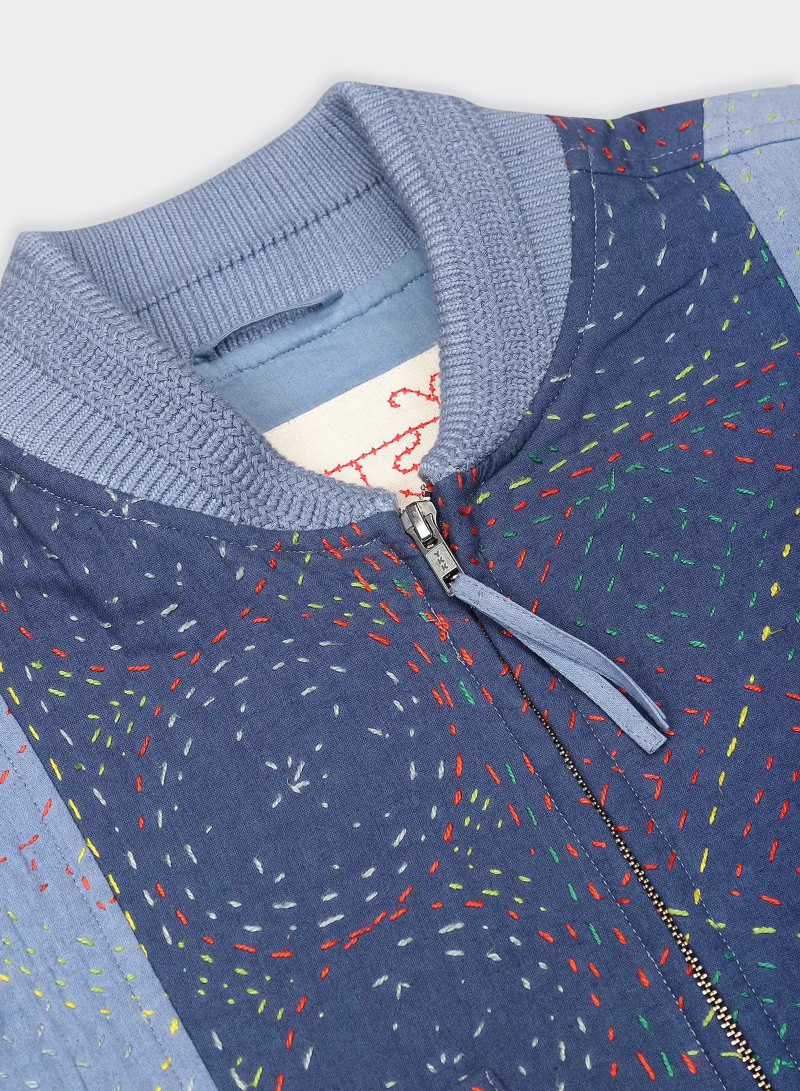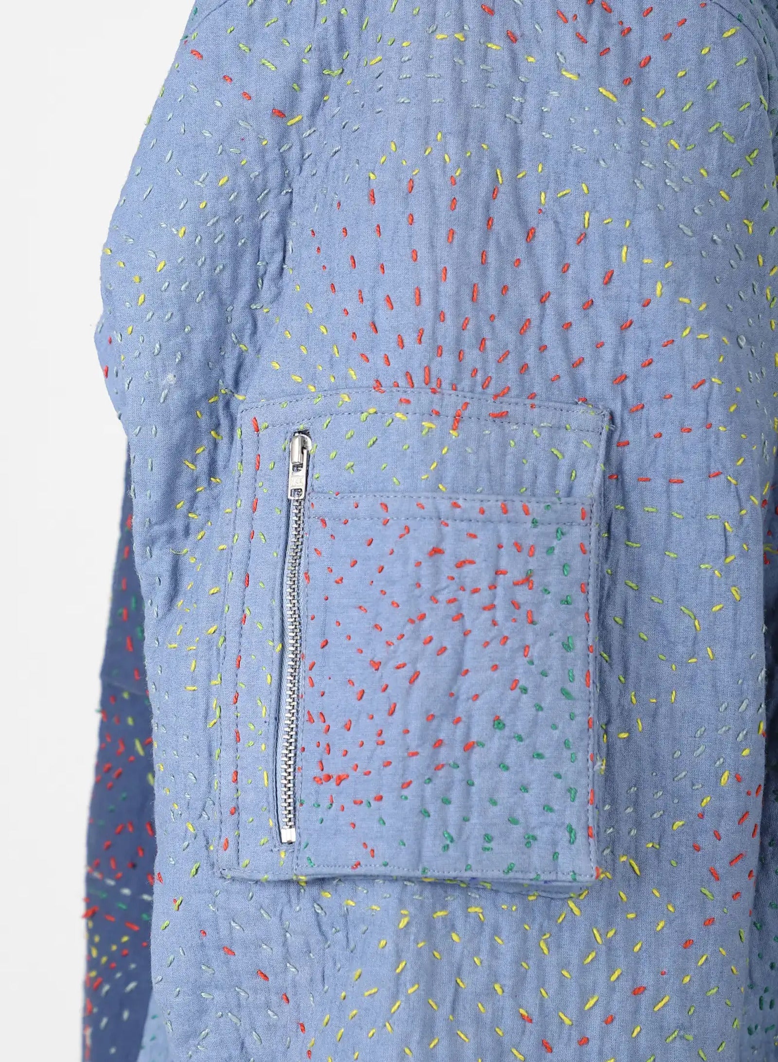 We work with cotton panels that have been overdyed before being joined into garments, each one embroidered in the kantha tradition. The stitching is done by hand in a simple running line, often carried from memory rather than a marked pattern. It binds the layers with strength while leaving a raised surface that changes how the cloth catches the light, bringing dimension to the fabric as it is worn.