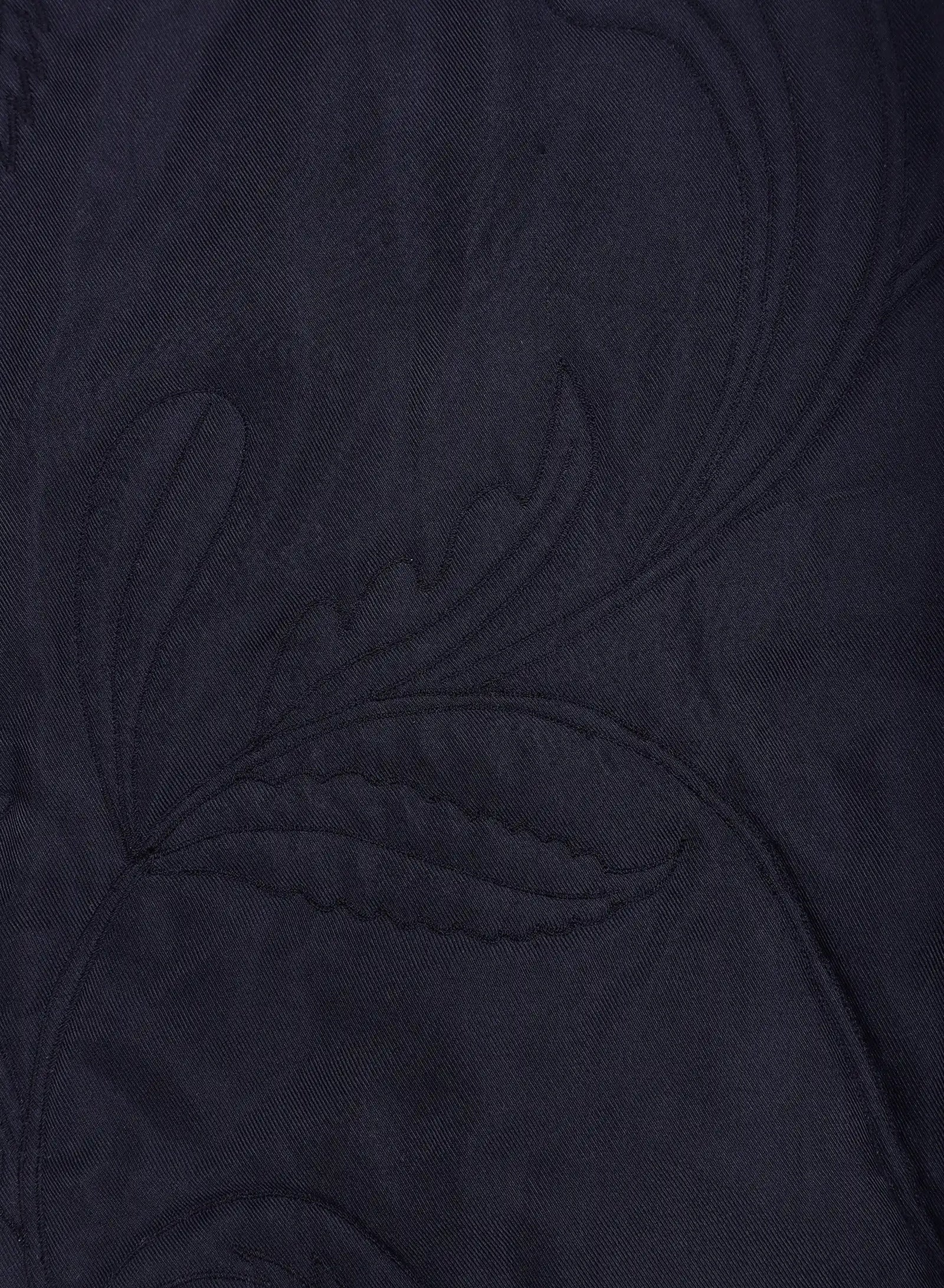 Woven in 100% silk twill, this fabric carries a soft sheen and a fluid, elegant weight—made more intricate by the Ari technique, a form of chain stitch embroidery practiced for generations in West Bengal. Each panel is embroidered on a frame before the garment is constructed, guided by Ashmat Ali, a seasoned artisan from Kolkata, with over two decades of craft behind him. This slow, deliberate process gives the fabric a pulse that carries into the final form of our designs.