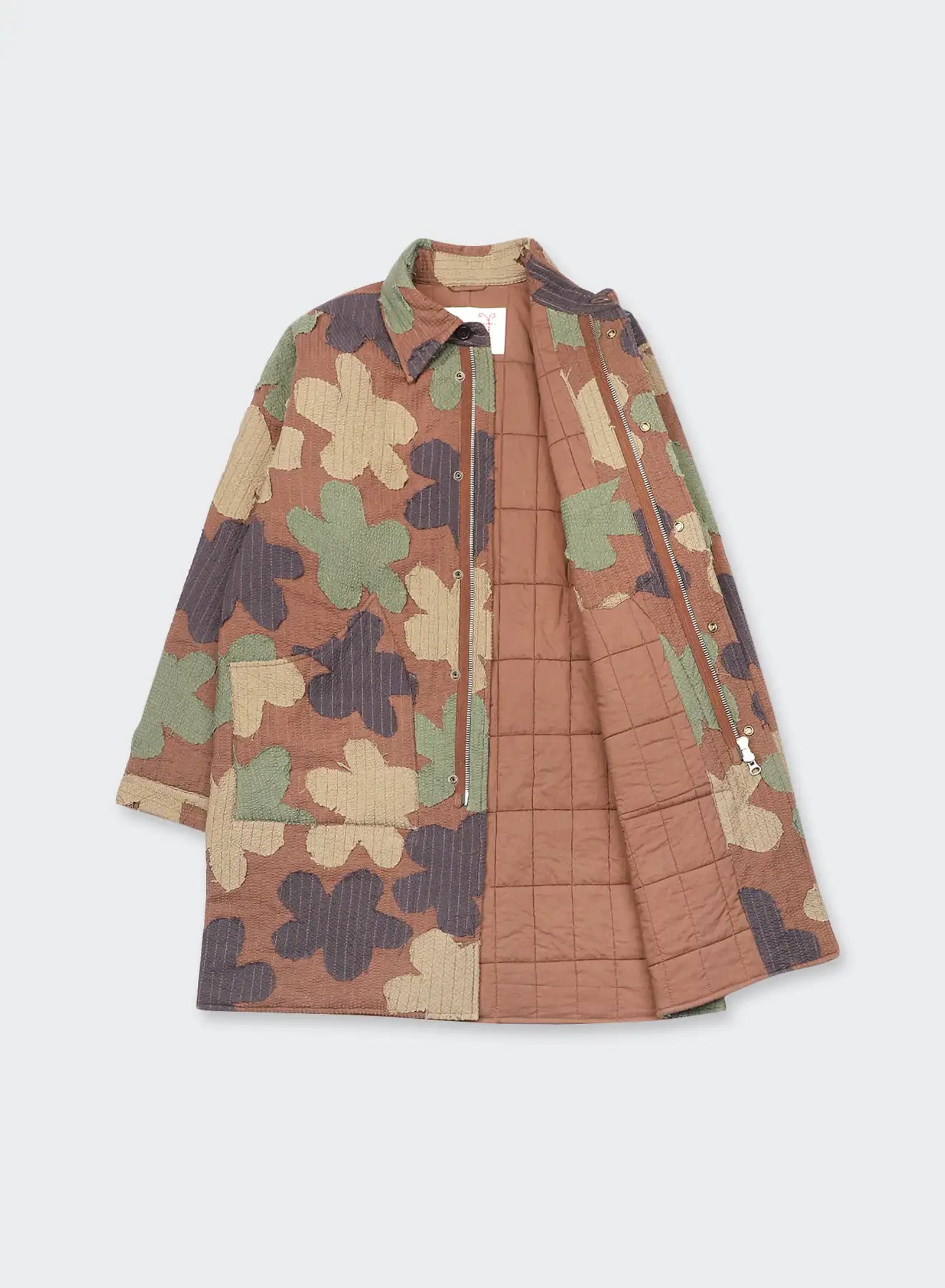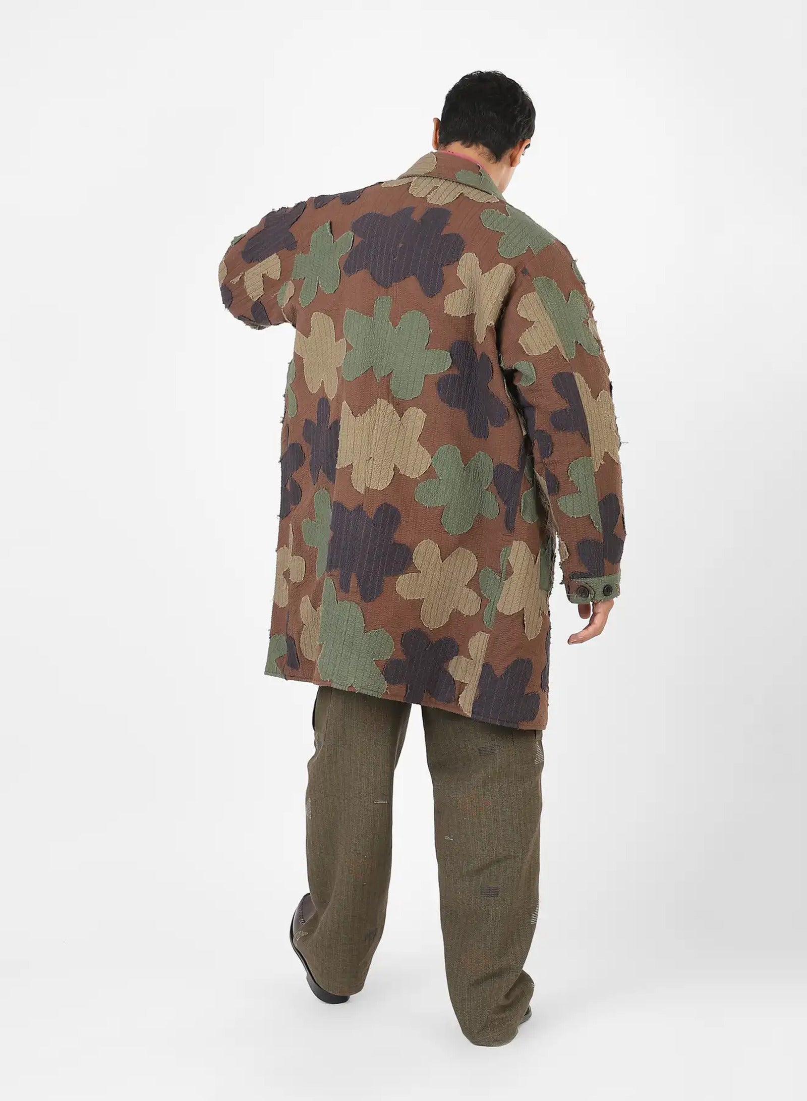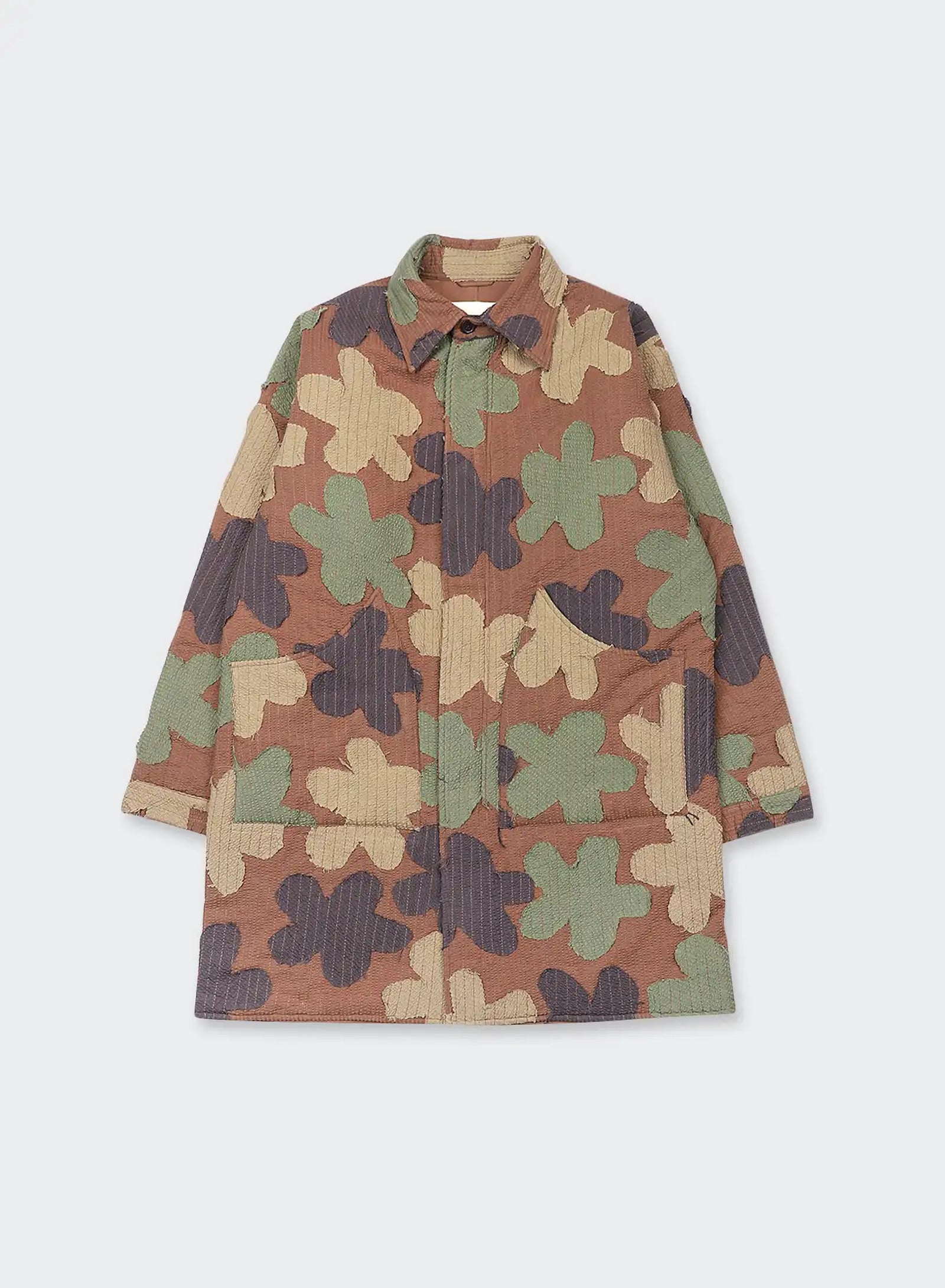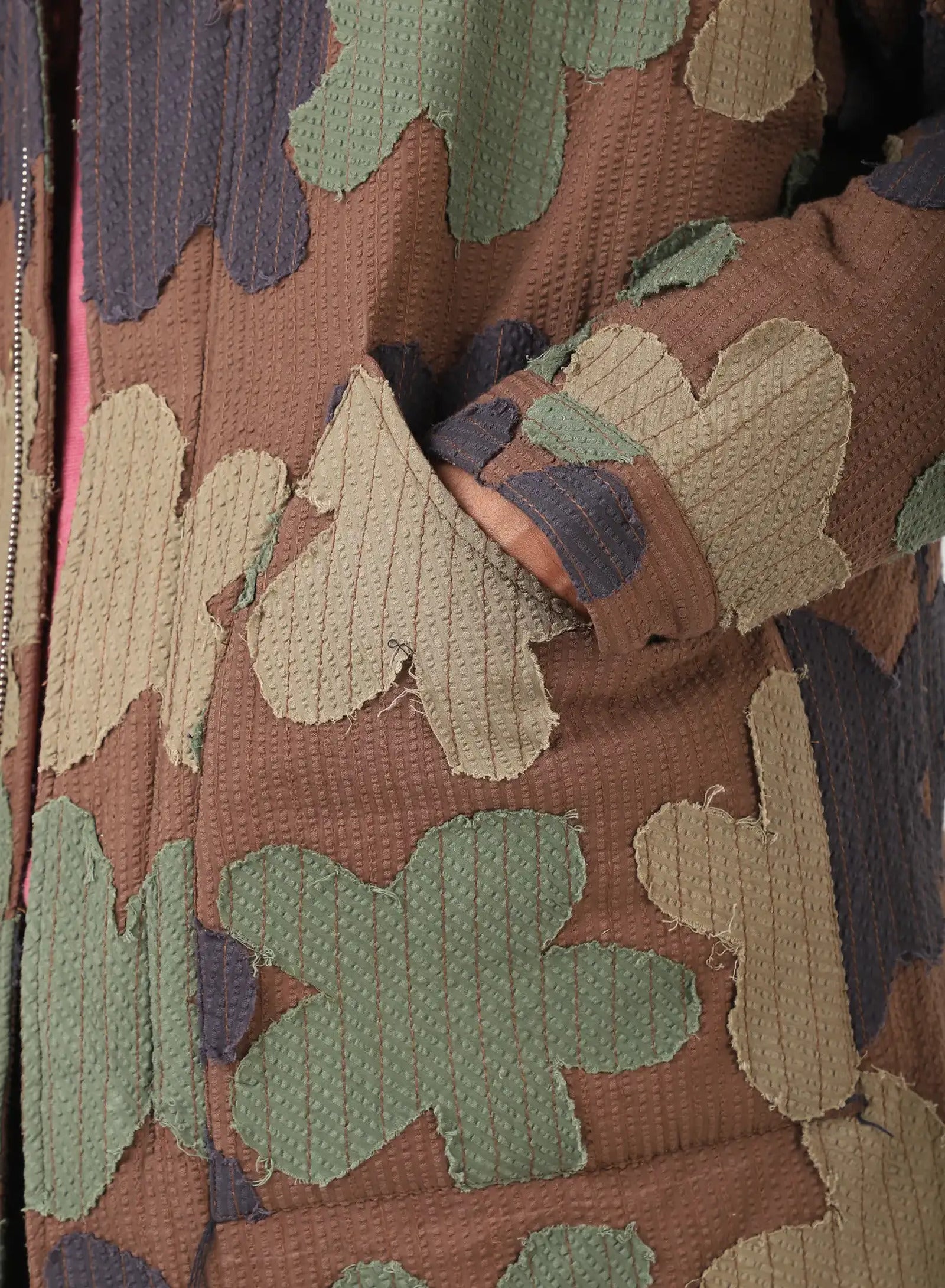 We cut dead stock cotton seersucker, dyed in four colours, into floral shapes that are quilted together in a camouflage arrangement. The raw edges are left visible, softening the outlines as the fabric is used and handled. What results is a surface layered with colour, pattern, and texture — one that shifts with wear, changing slowly in both look and feel over time.