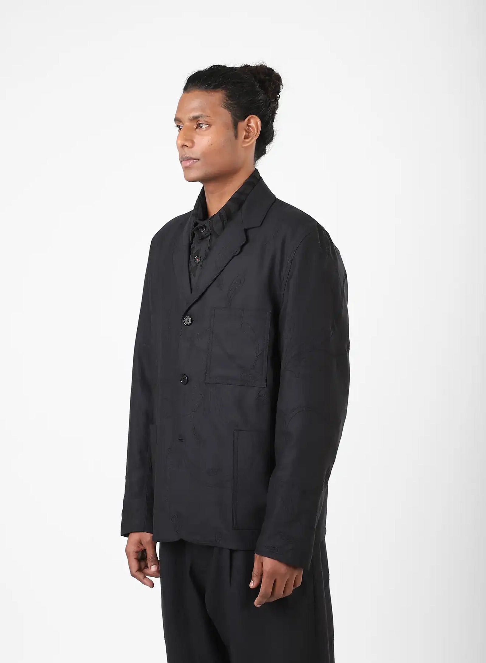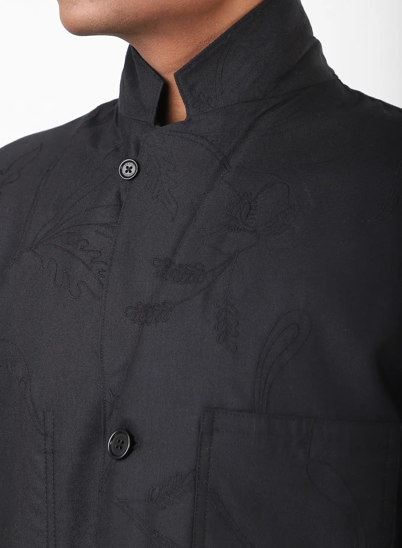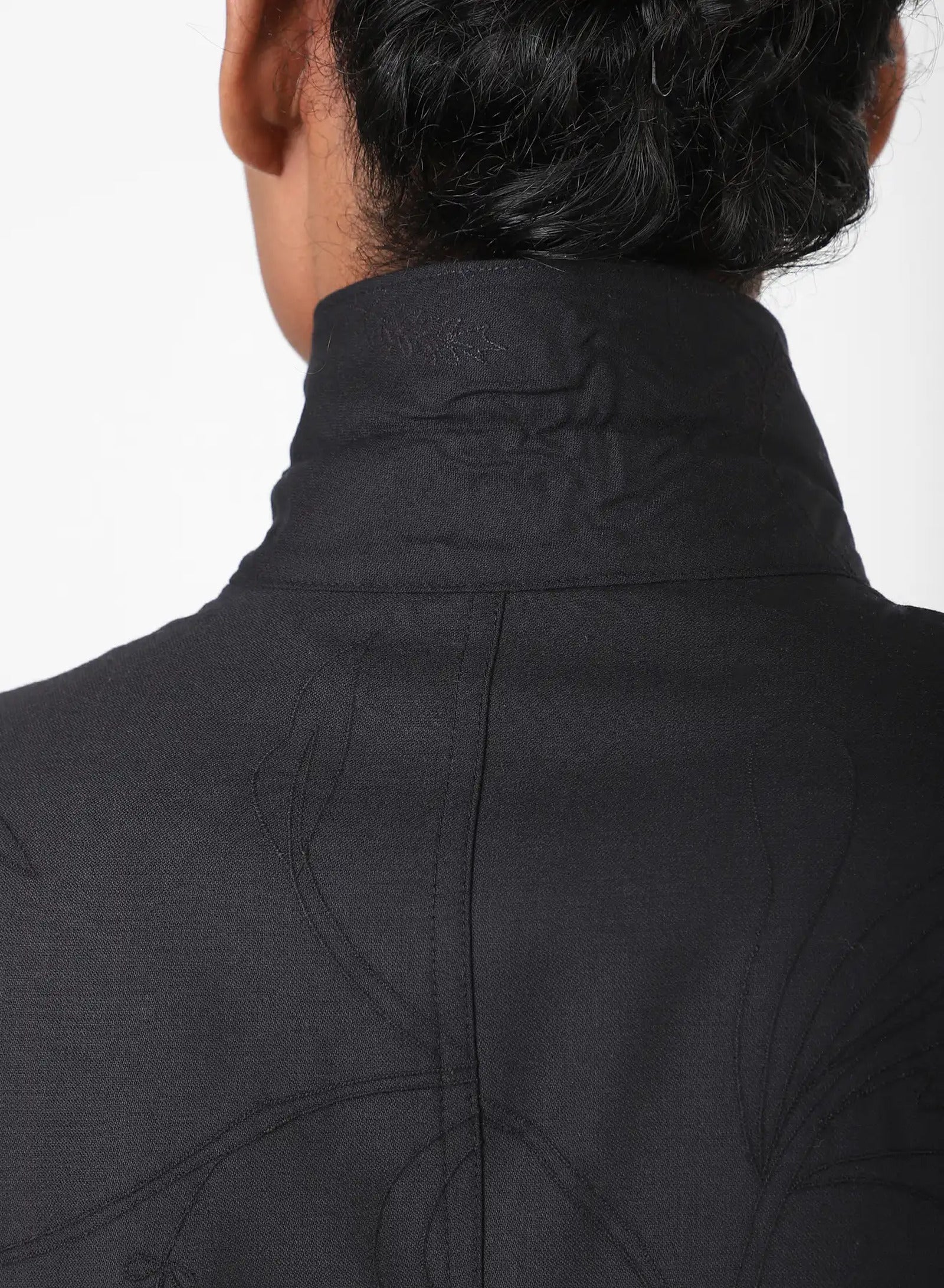 Woven from Super 120s wool at Huddersfield—one of India’s finest suiting mills—this cloth holds its shape with ease and refinement. We've known its grain intimately: how it falls, how it holds, how it yields under a thread. Light on the body, the fabric carries a fluid drape that allows ease of movement while holding its line with natural crease resistance. Our relationship with this fabric makes it a natural canvas for embroidery—each motif guided by hand on a sewing machine by seasoned artisan Hasmat Ali, practicing his craft from a space tucked just behind our studio.