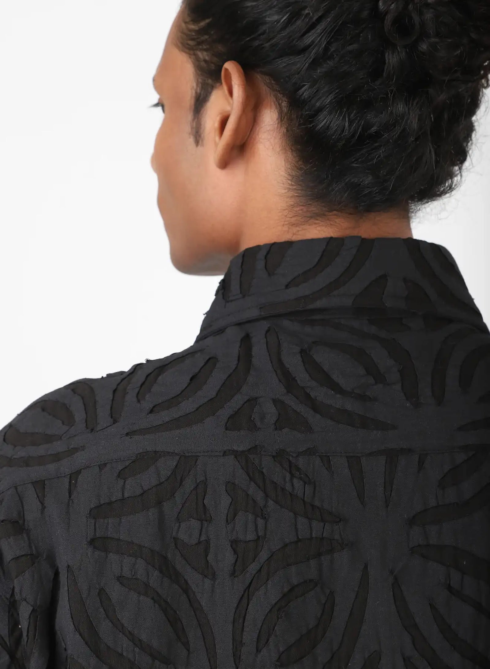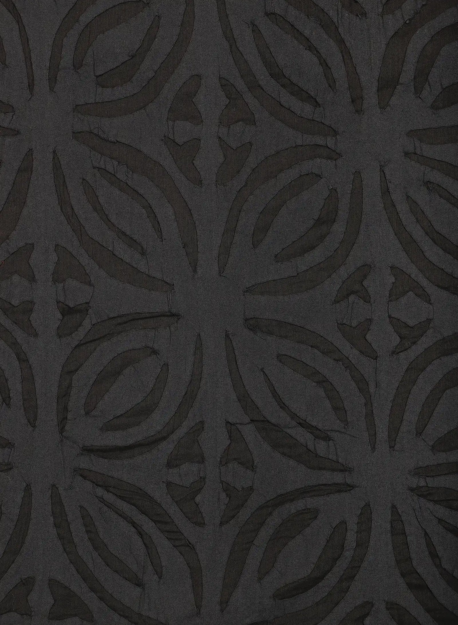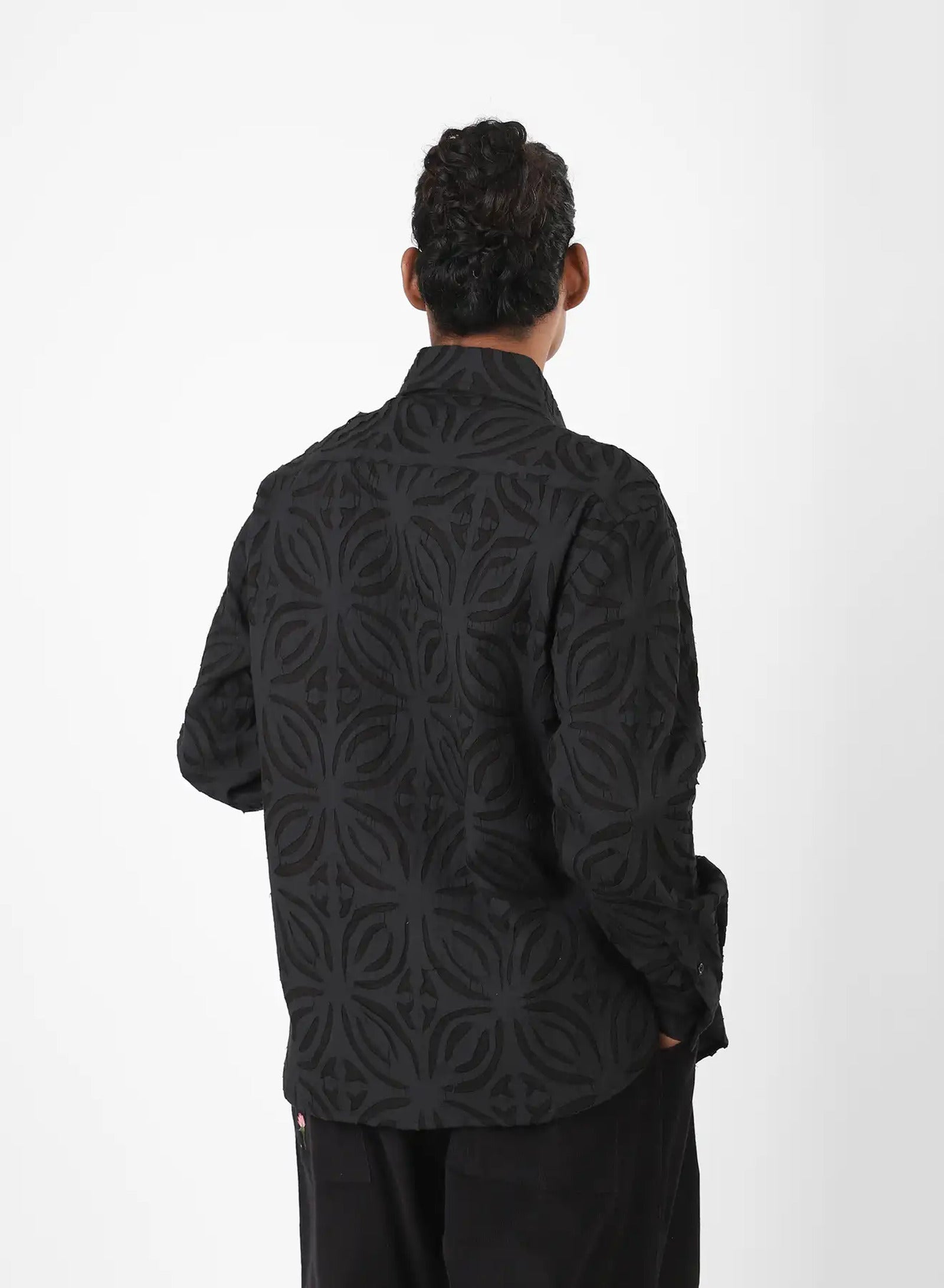 We draw from the Sanjhi tradition of paper-cut stencils, beginning with floral or geometric shapes embroidered into the cloth before their centres are cut away by hand. The fabric is then dyed with plants at Bio Dye, where colour settles around the cut edges to frame each form. What remains is a play between solid and open — a fabric that carries the depth of embroidery and the lightness of sheer, shifting as light moves through it.