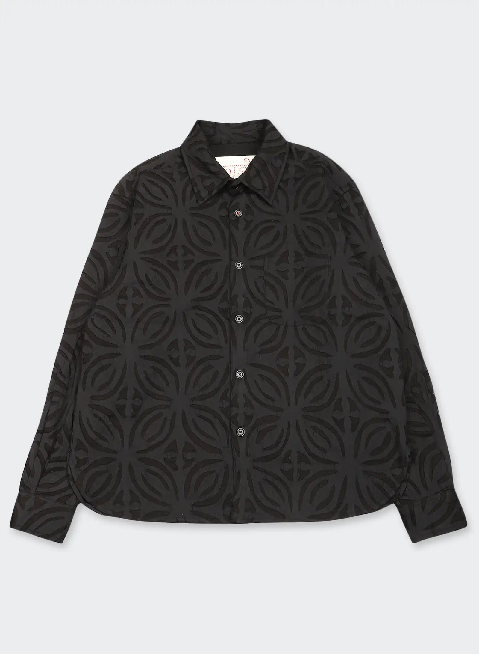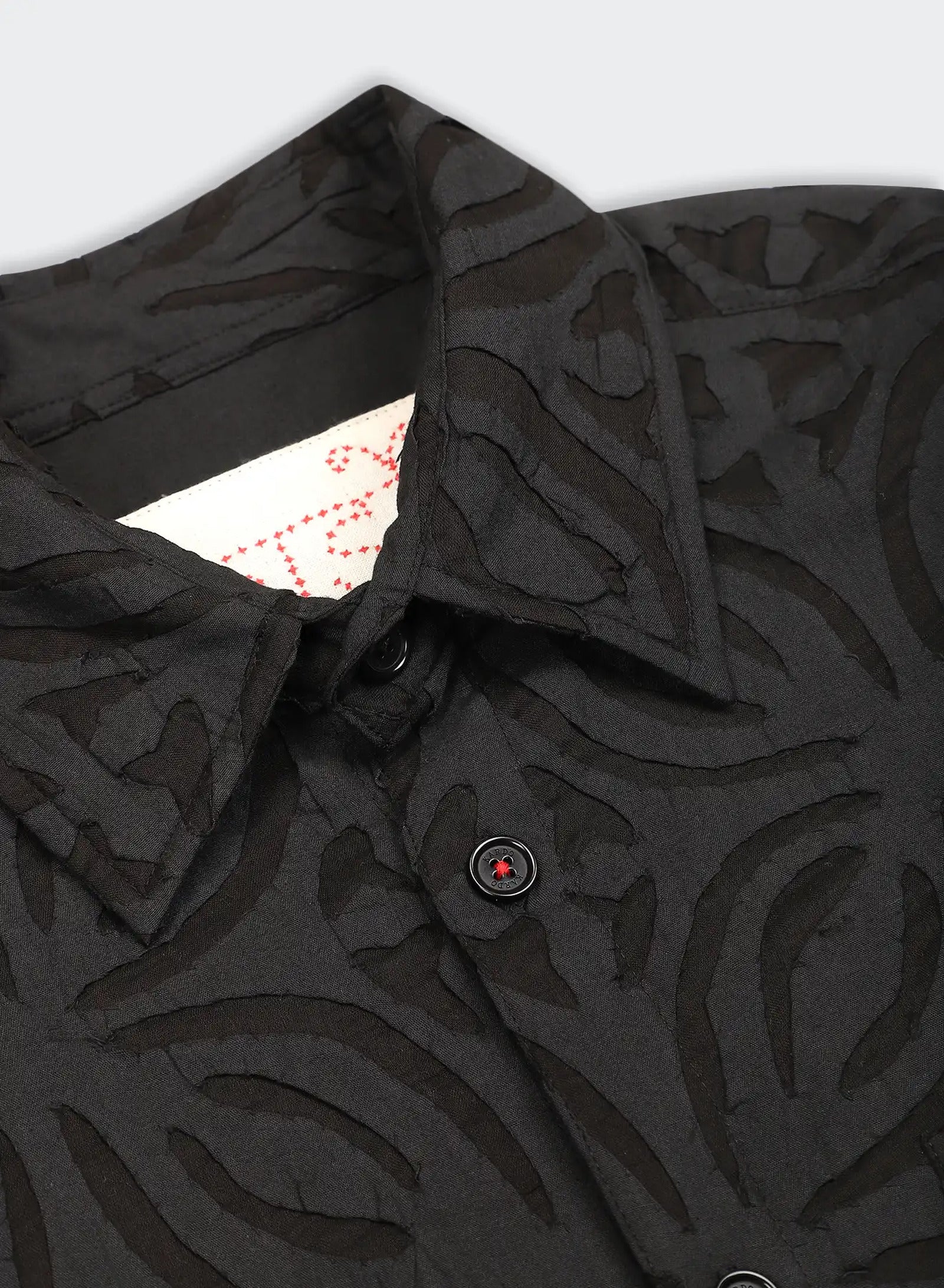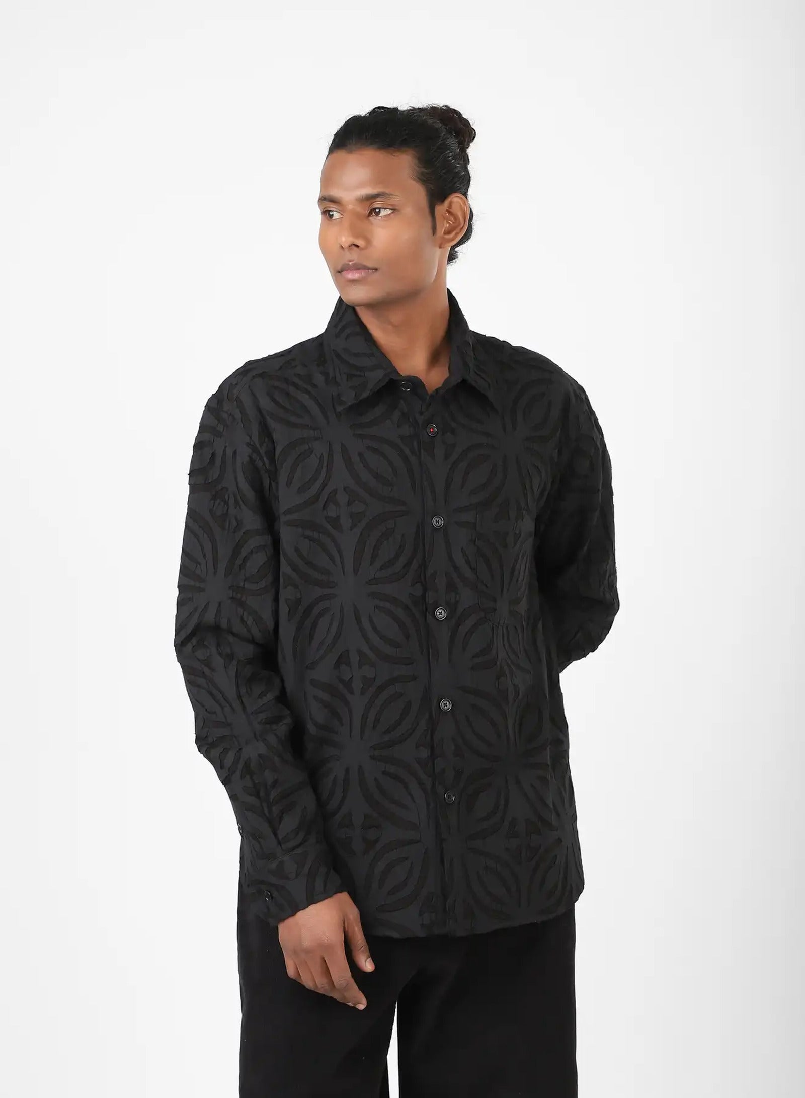 We draw from the Sanjhi tradition of paper-cut stencils, beginning with floral or geometric shapes embroidered into the cloth before their centres are cut away by hand. The fabric is then dyed with plants at Bio Dye, where colour settles around the cut edges to frame each form. What remains is a play between solid and open — a fabric that carries the depth of embroidery and the lightness of sheer, shifting as light moves through it.