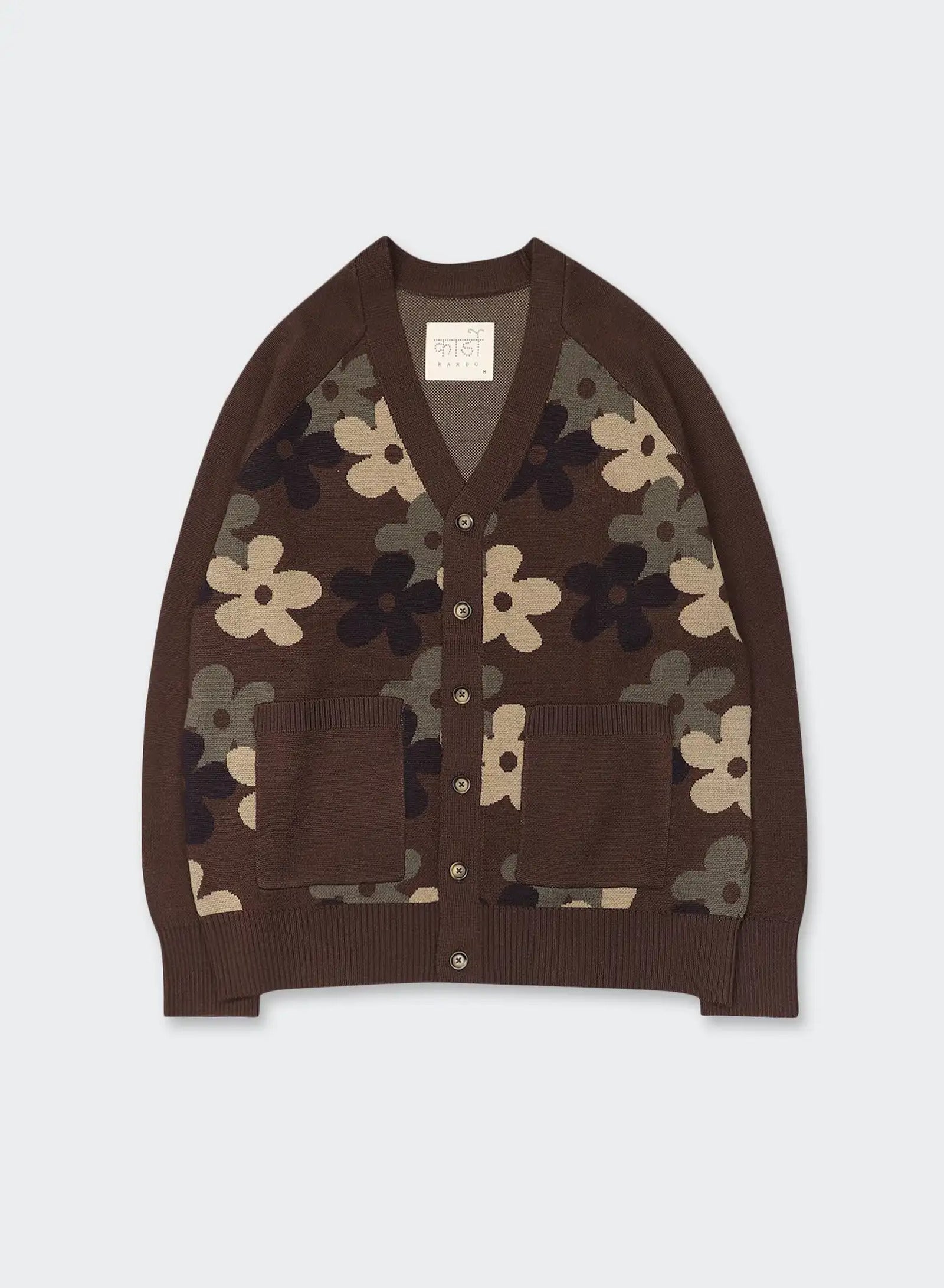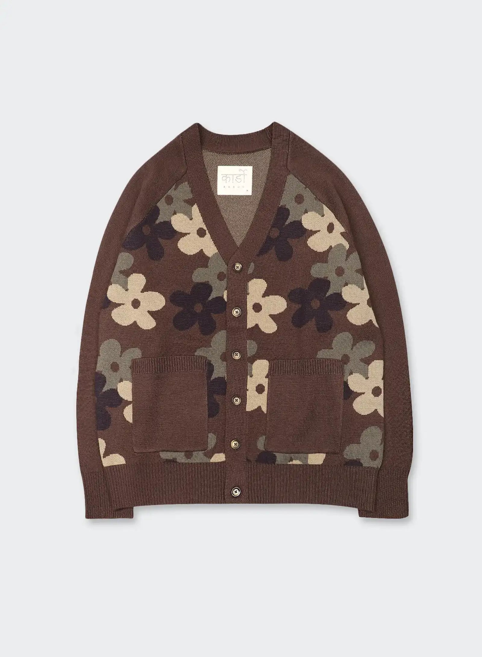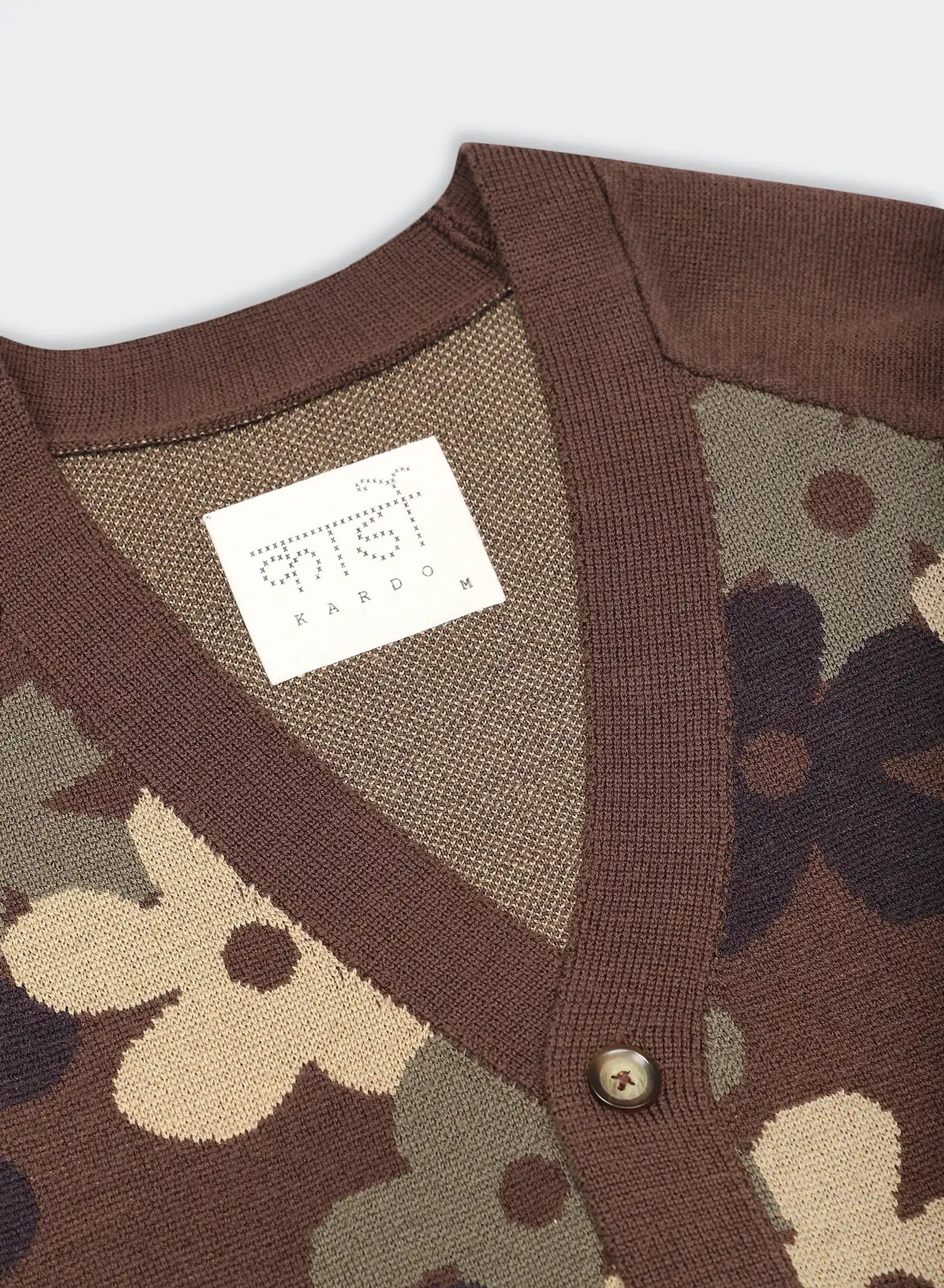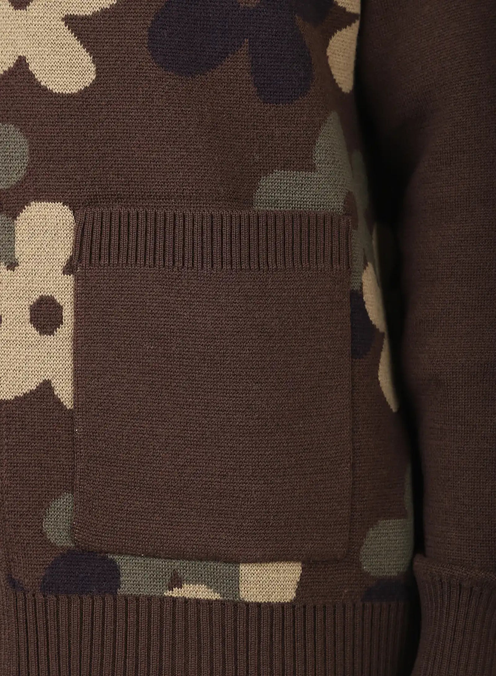 We work with merino wool, knitted on digitised machines through a jacquard technique that brings to life a floral camouflage and a geometric pattern. Drawn from our studio, the motifs settle seamlessly into the knit, their detail held with definition while the wool lends its natural warmth and ease. The fabric sits between comfort and structure — soft in hand, strong in shape — carrying the boldness of a woven design in the familiarity of knitwear.