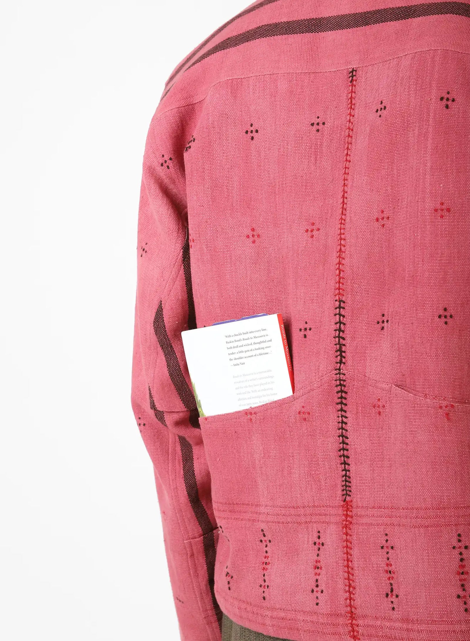 We work with kala cotton, an indigenous rain-fed variety from Gujarat, handwoven by Laalji Bhikha Vankar, a master weaver in Kutch. Here he uses the Tangaliya technique, twisting extra weft around warp threads to raise tiny dots across the surface. These dots sit like beads within the weave itself, shaping lines and patterns as the cloth grows on the loom. In hand, the fabric holds the quiet weight of cotton, punctuated by a texture that marks Tangaliya as its own.