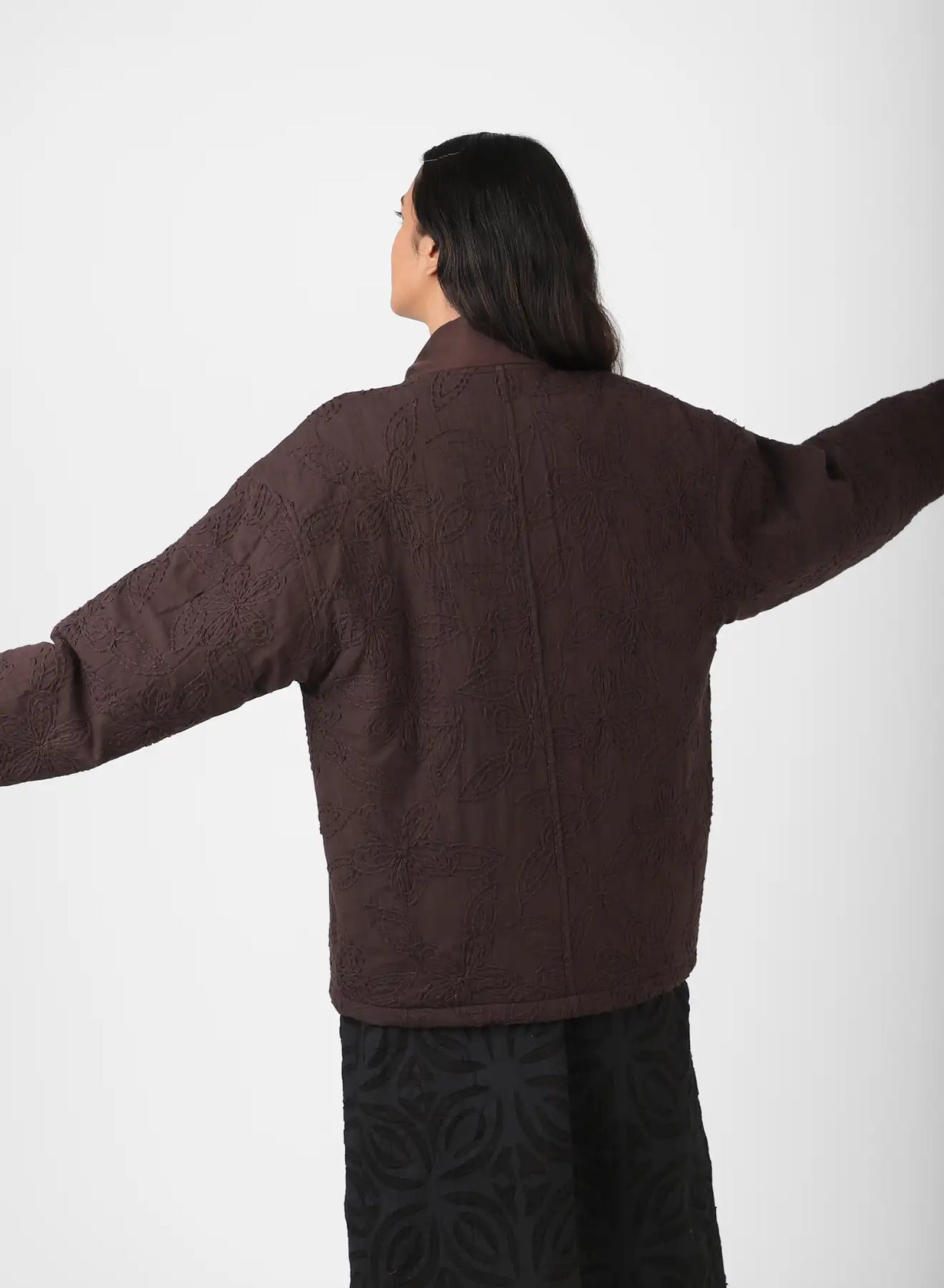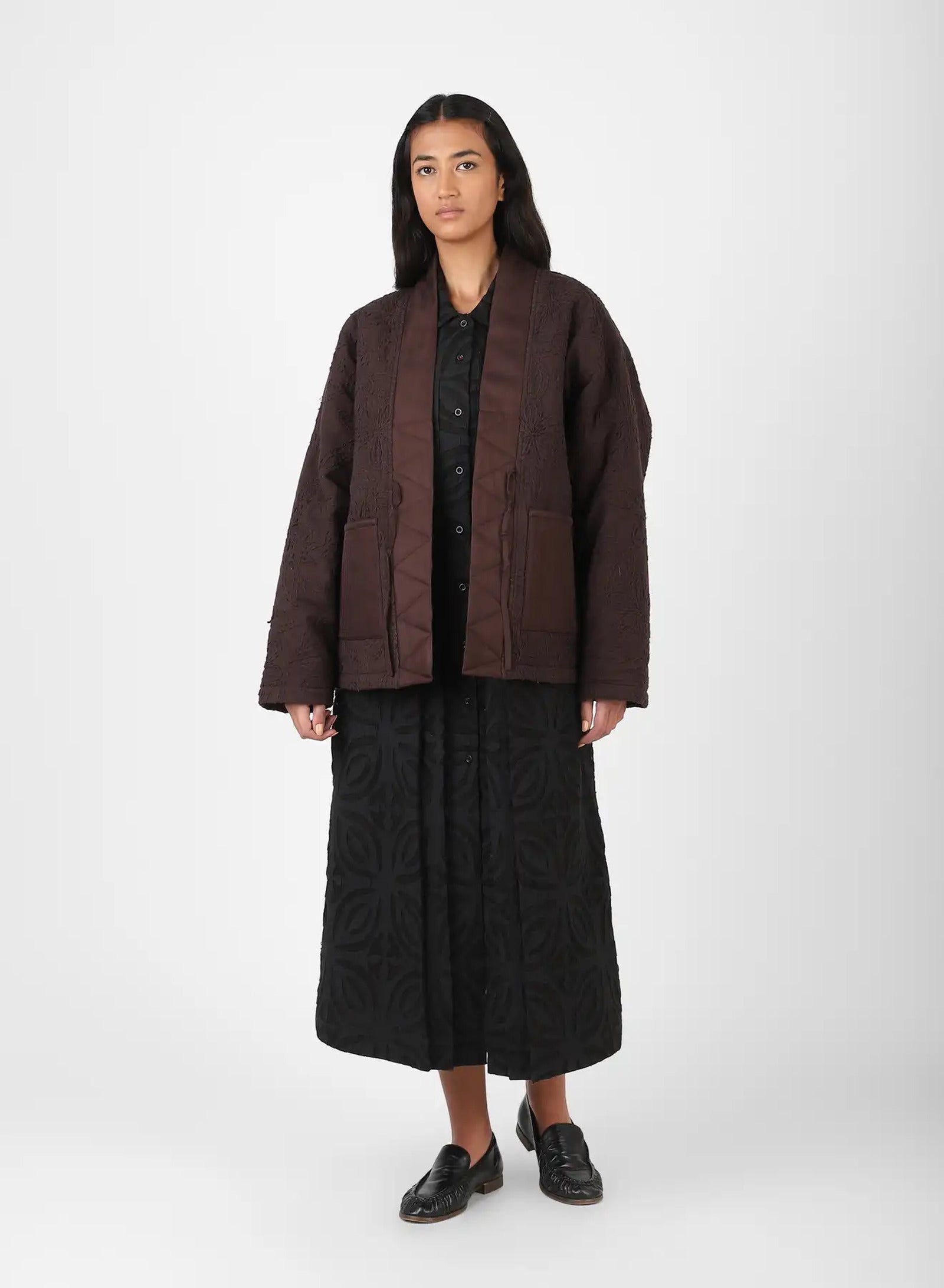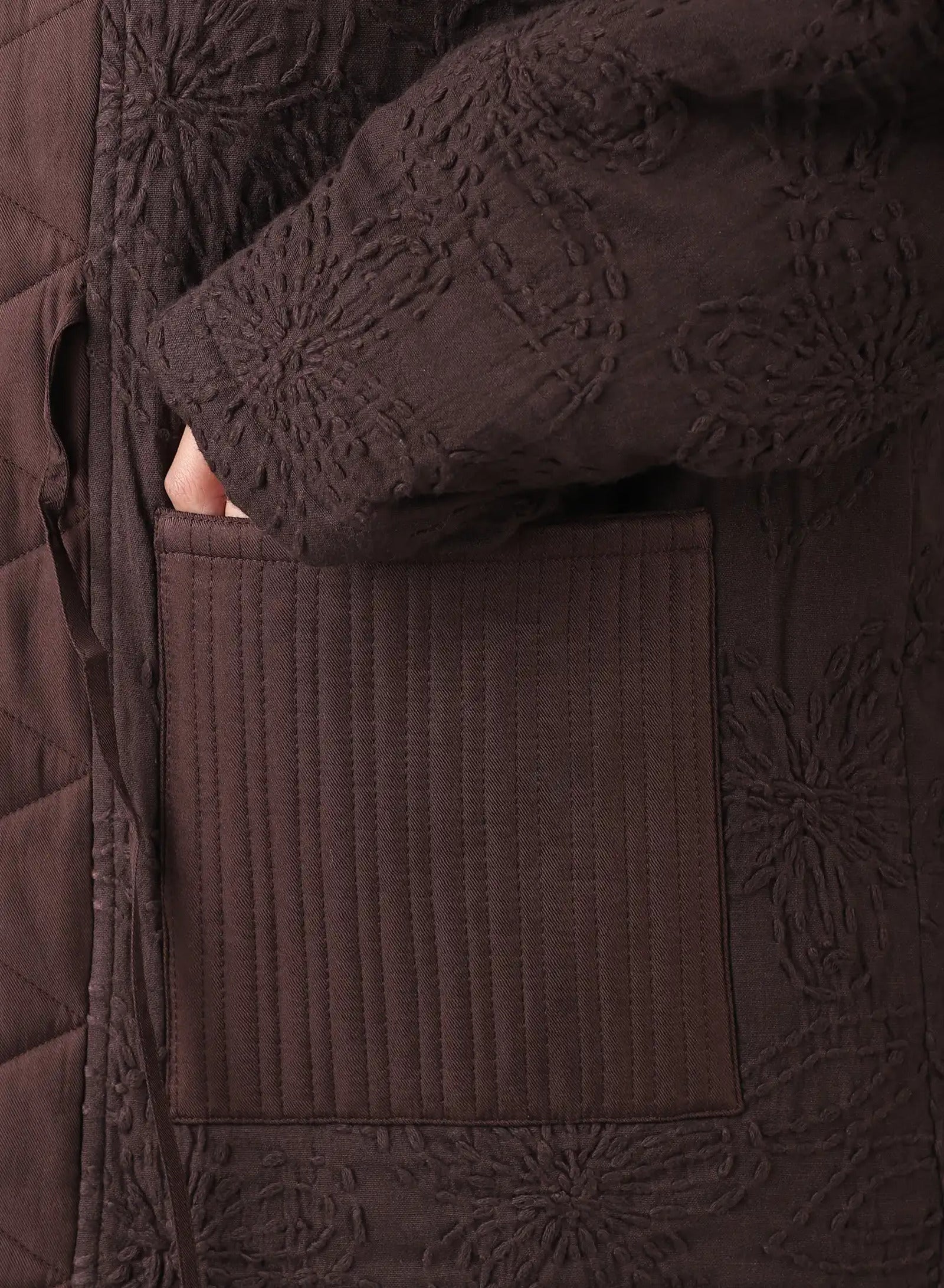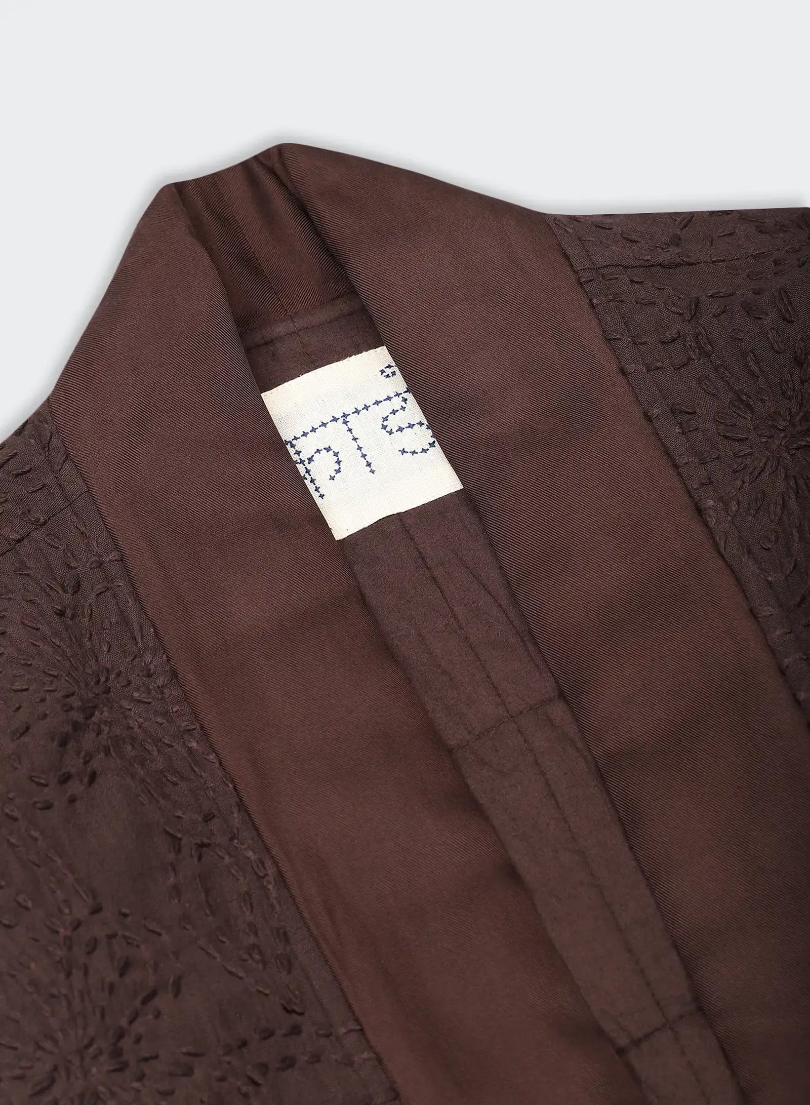 We work with a hemp–cotton fabric, embroidered by hand with thick threads in a floral design before being dyed with plant-based colour at Bio Dye. Into this surface we set panels of silk twill, their smoothness placed against the texture of the embroidery. The cloth is joined with fine binding, bringing together varied fibres and finishes in a fabric that feels composed, detailed, and made to last.