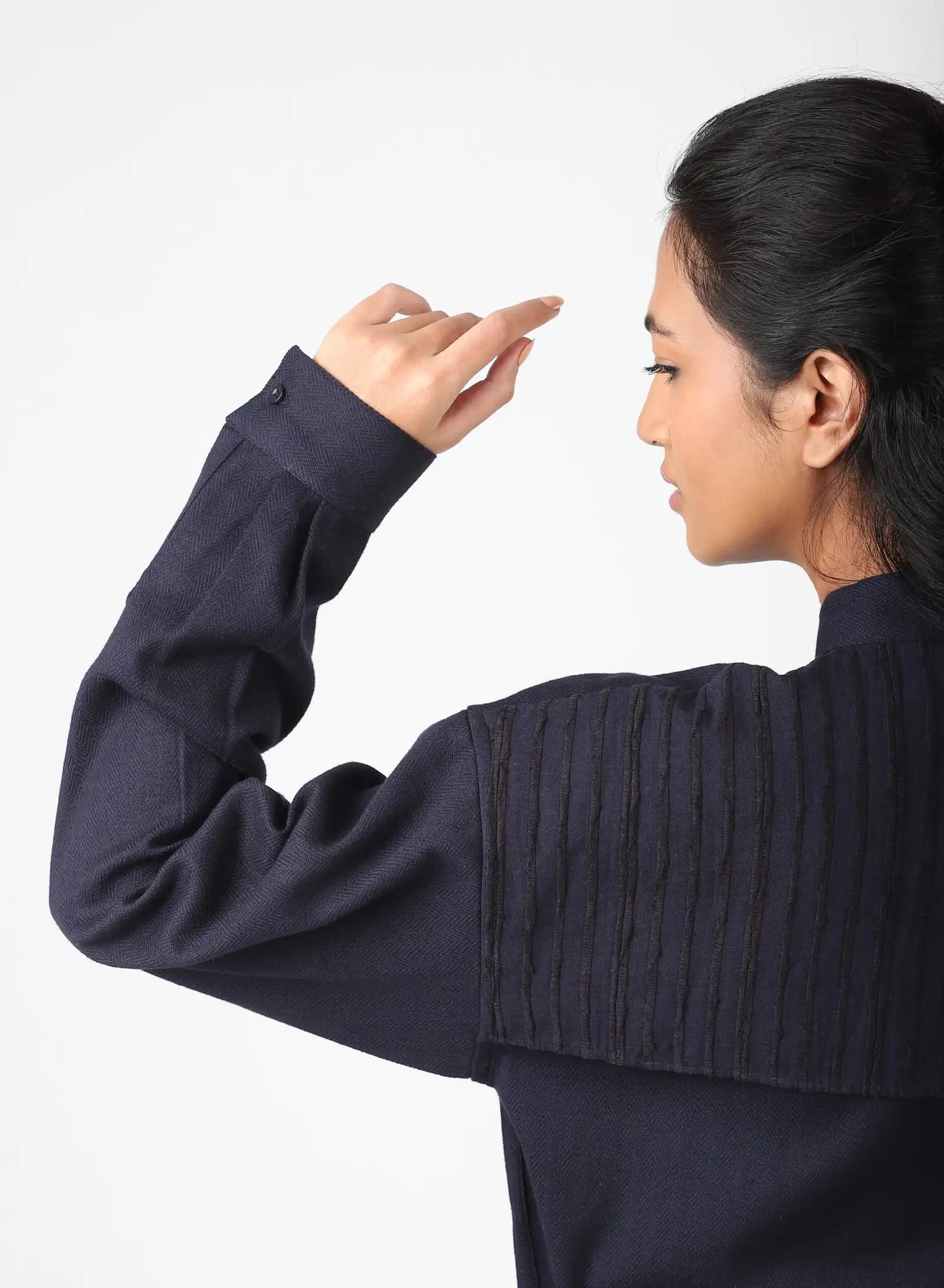 Our cotton herringbone meets the slow precision of extra weft weaving in this cloth. On the handloom, thicker threads are inlaid into the warp to form motifs, each one set into place by hand. The herringbone gives the fabric its ordered backbone, while the extra weft brings small moments of raised texture that can be felt across the surface.