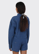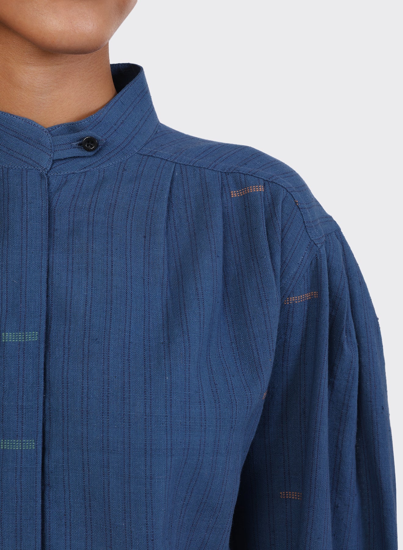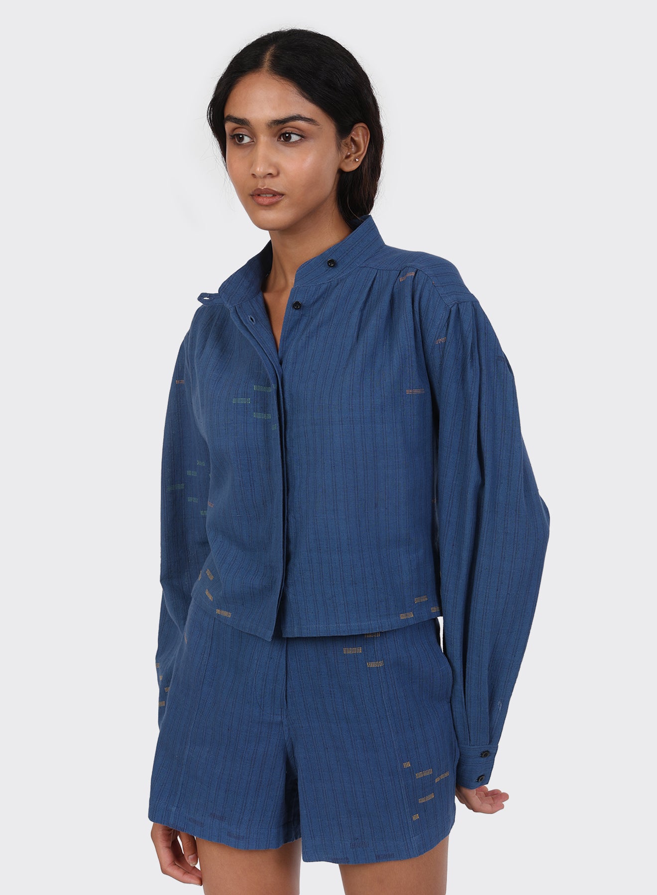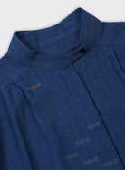 AAKRITI is cut with a shorter frame through the body, holding its line close to the upper torso. The shape gathers gently at the top before releasing into a clean, open fall. The silhouette stays light and contained, carrying its volume near the chest while leaving the lower edge free and unweighted.