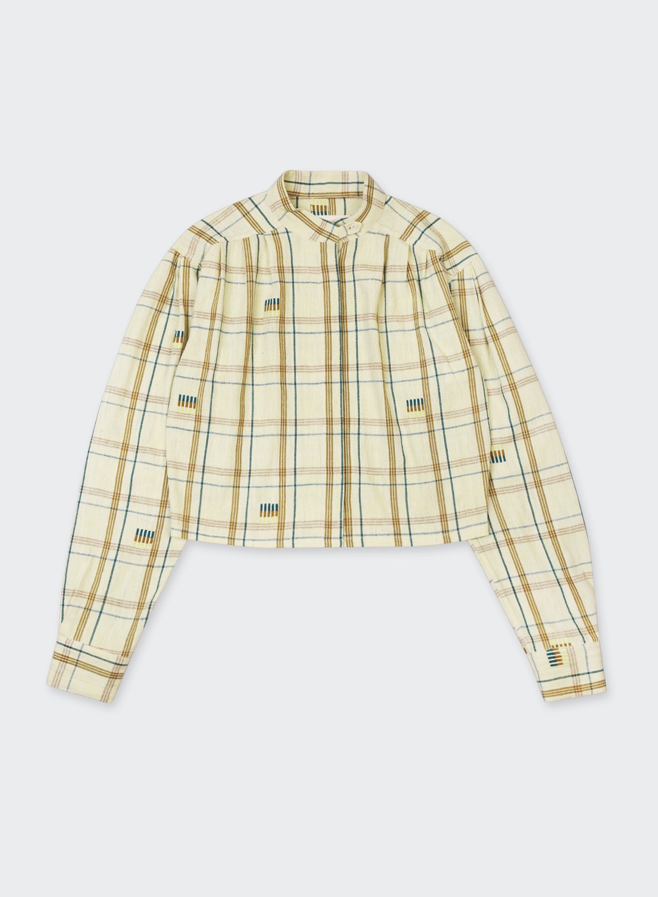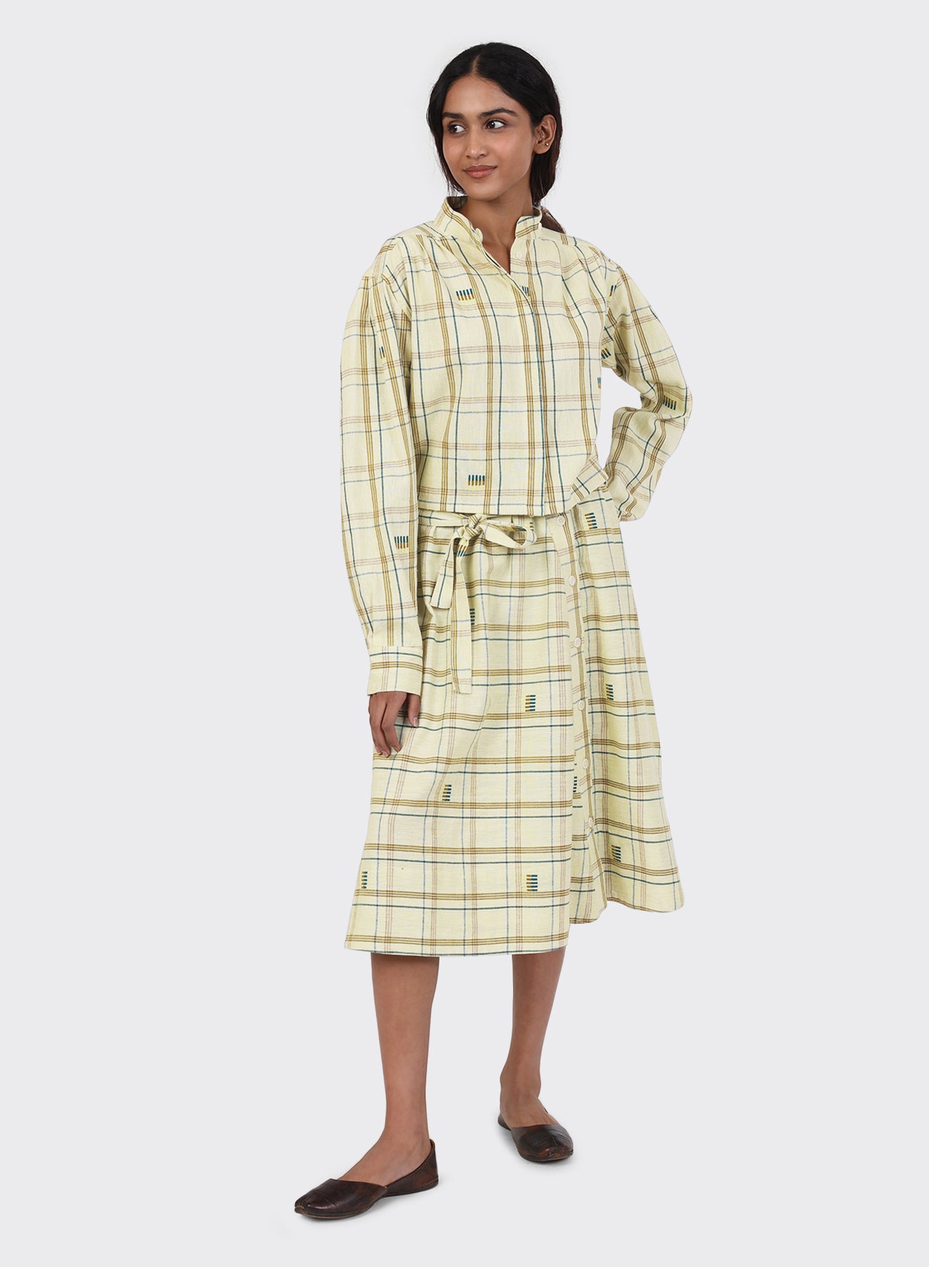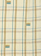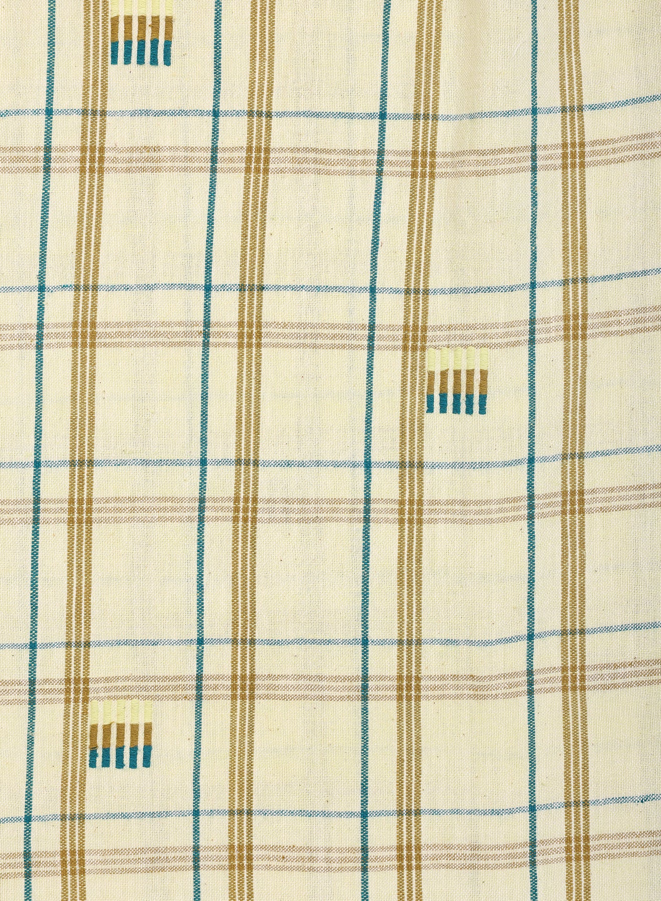 Dyed yarns are handwoven into a check pattern, enhanced with motifs using the extra weft technique—a meticulous, discontinuous weaving method where denser threads are hand-inlaid into the warp.