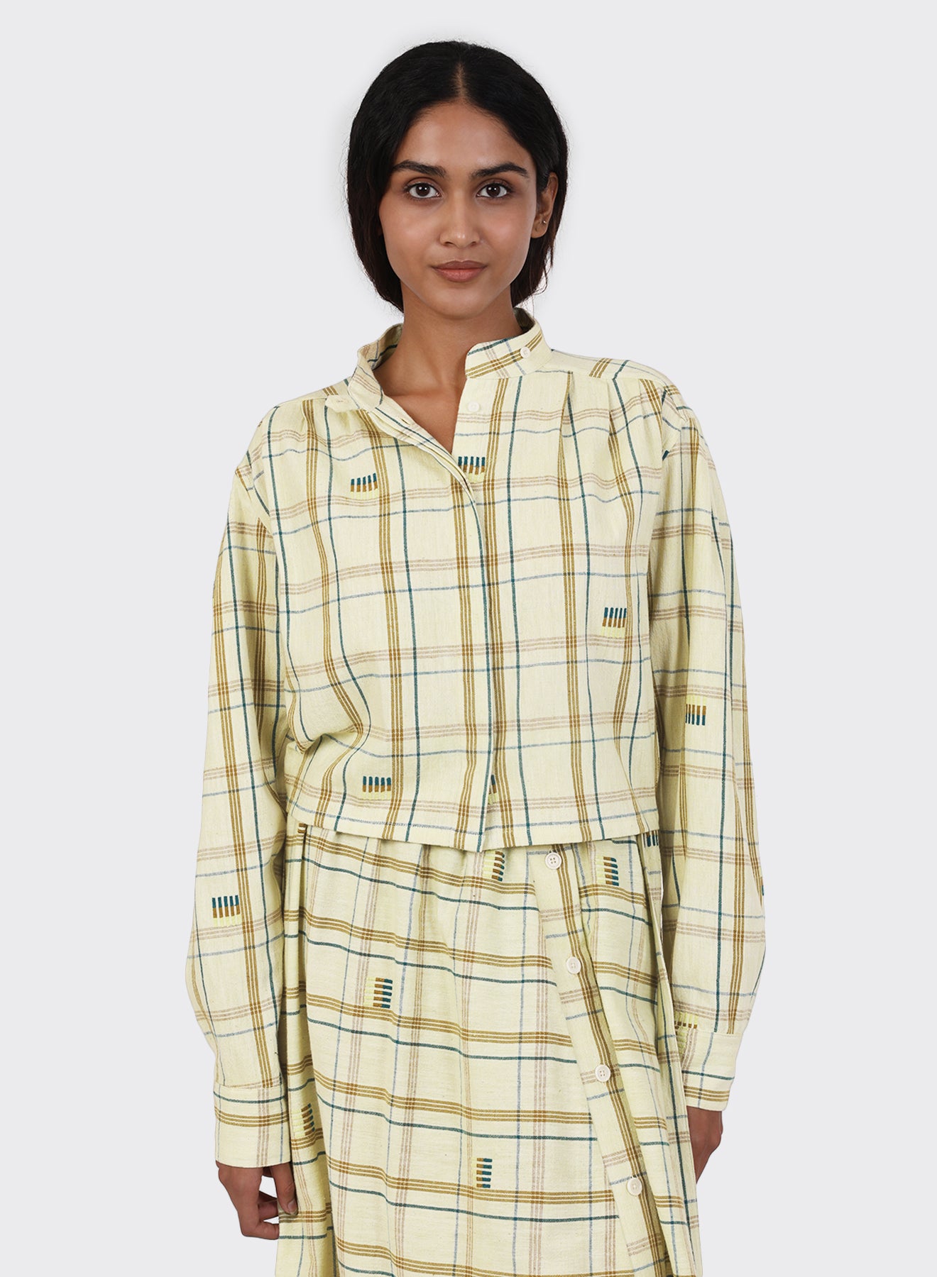 AAKRITI is cut with a shorter frame through the body, holding its line close to the upper torso. The shape gathers gently at the top before releasing into a clean, open fall. The silhouette stays light and contained, carrying its volume near the chest while leaving the lower edge free and unweighted.